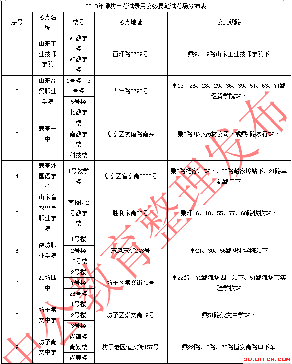 2015年山東【濰坊】公務員考試考場考點分布指南尚未公布,考生可以參照2014年山東濰坊公務員考試考場考點分布指南提前熟悉考場信息。中公網(wǎng)校特整理匯總此頁面,將于第一時間更新2015濰坊公務員考試考場考點分布指南信息匯總,備考專家提醒各位考生CTRL+D保存網(wǎng)頁,方便后期查詢,以免錯失相關(guān)考試信息,??荚?