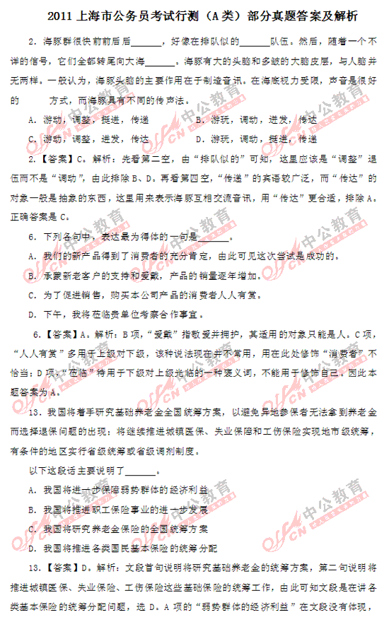 2011上海市公務員考試行測(A類)部分答案及解析